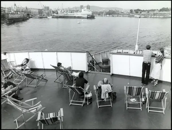 danskebåt "Peer Gynt", skipsdekk, mennesker, fluktstoler, fjord, Akers mek. verksted, rådhuset, Akershus festning
