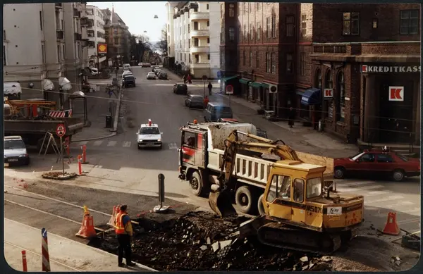 gatekryss, gateløp, anleggsarbeid, omlegging av trikkeskinner, gravemaskin, lastebiler, biler, mennesker, bygårder