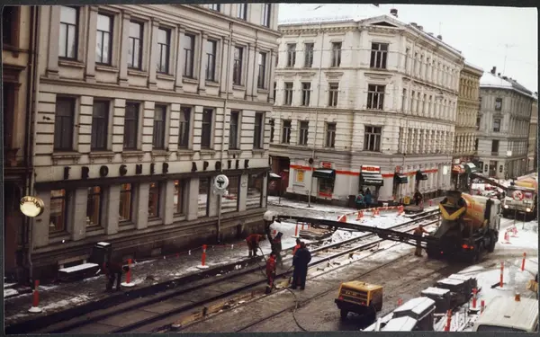 gateløp, anleggsarbeid, omlegging av trikkeskinner, sementbiler, menn, anleggsarbeidere, bygårder, Frogner apotek, snø