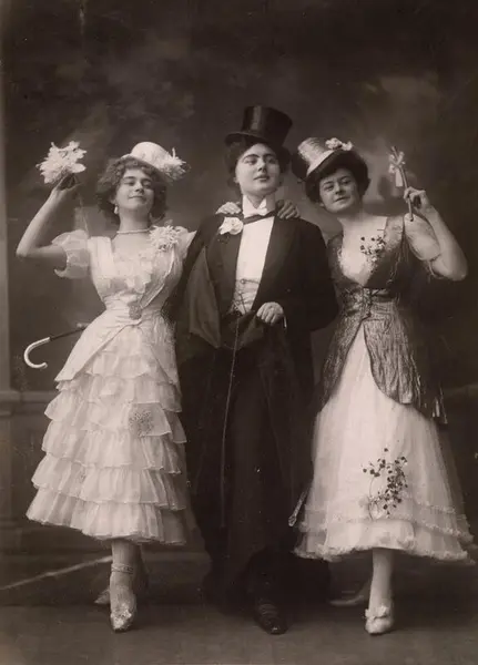 trippelportrett, kvinner, stående helfigur, kostymer