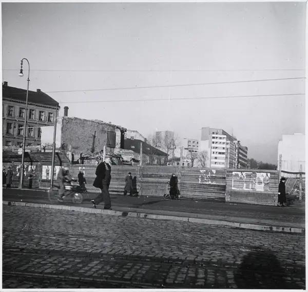Tivoli, anleggsarbeid, forberedelser til bygging av Rådhuset, plankegjerde, anleggsområde, bygård, Vika politistasjon, kontorbygninger, mennesker