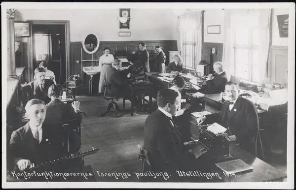 Jubileumsutstillingen 1914, paviljong, Kontorfunksjonærenes forening, interiør, menn, kvinner, skrivebord