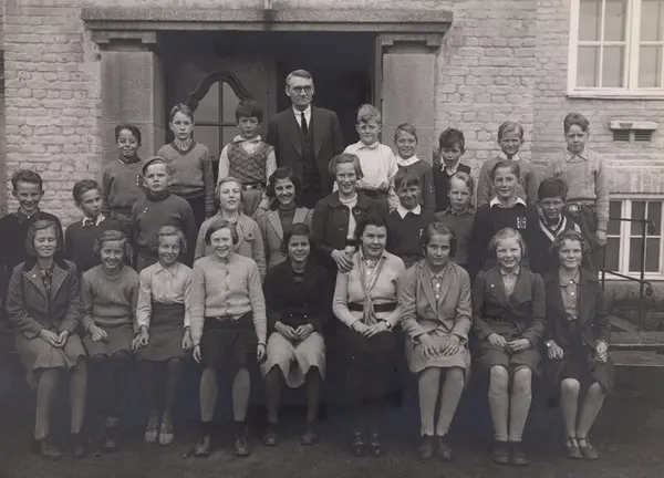 Sittende fra venstre: Inger Marie Kolle, Borgny Bjurstrøm, Inger Marie Tufte, Else Marie Olsen, Ingeborg Malm, Elizabeth Skjelsvik, Signe Ihlen, Sonni Holtedahl, Siri Rhode. Stående 2. rekke fra venstre: Egil Haxthow, John Hjalmar Smith, Erik Brun, Ellen Engebretsen, Laila Messmann, Anna Sofie Roscher-Nielsen, Gunnar Bugge, Christian Steen, Knut Roul, Finn Børsum. Stående 3. rekke fra venstre: Christian Bugge, Ulf Westerby, Just Ebbesen, lektor Eikre (klasseforstander), Nicolai (?) Julius (?) Nicolaisen, Lars Røhrholt, Bror Børsum, Johannes Bødtker, Hans Buckholt.