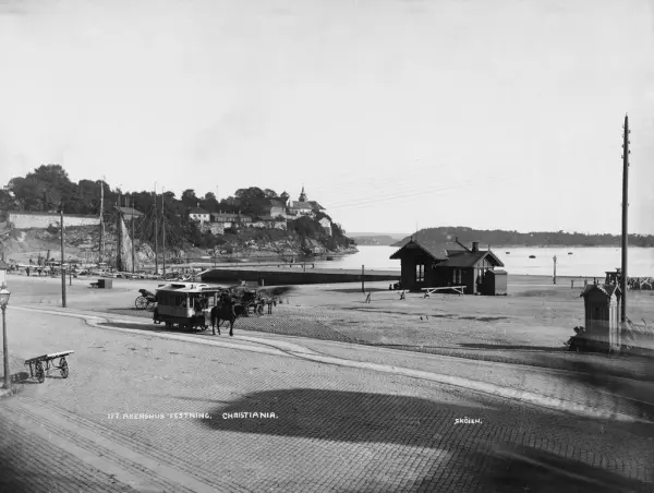 plass, hestesporvogn, hestekjøretøyer, havn, seilfartøyer, dampbåt, Akershus festning, badeanlegg, fjord, øy