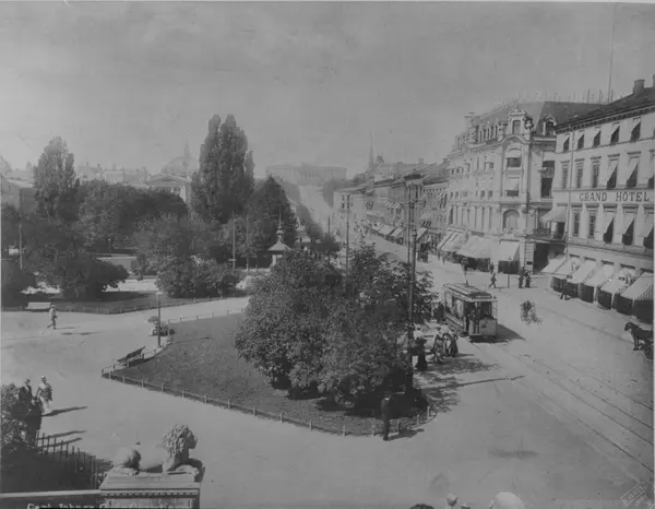 utsikt, løveskulptur, park, gateløp, gateliv, trikk (Grünerløkken), mennesker, Grand Hotel, hotell Nobel, forretningsgårder