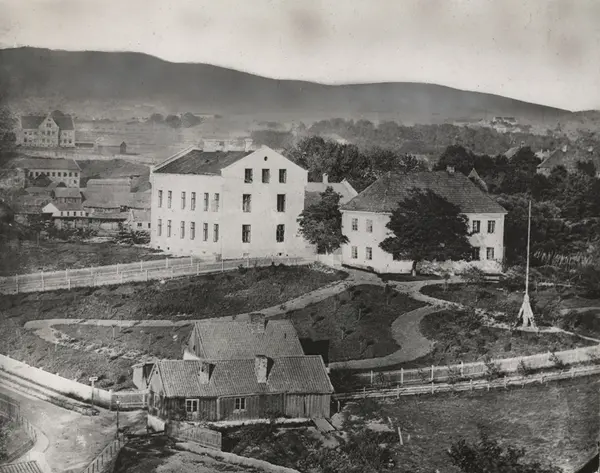Øvre Schultzehaugen. Gammel hovedbygning, revet omkring 1864 og ny hovedbygning, bygget 1864. I forgrunnen en husmannsstue og en portstue. Sagene skole i bakgrunnen til venstre. Foran den teglverket. Maridalsveien nede til venstre i bildet.