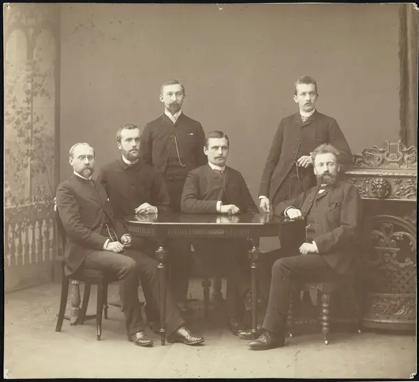 Stående bak: Per Møystad, Frederik Stang. Sittende fra venstre: Johan Jacob Woxen, Hans Blich Holst, Andreas Martin Seip, Haldor Sverre Vigander (Vig-Anderssen).
