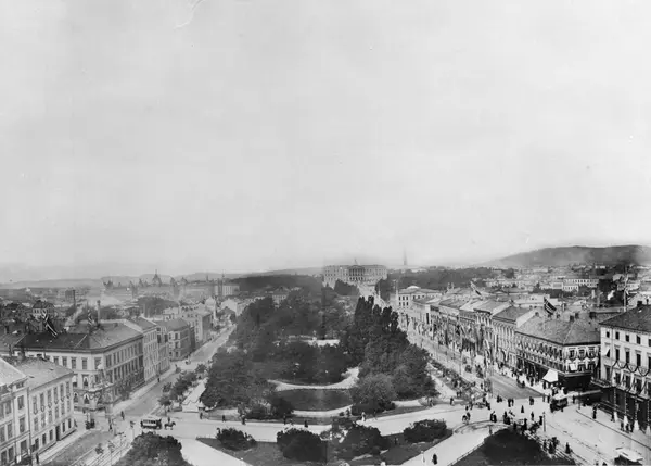 utsikt, park, gateløp, hestesporvogner, mennesker, gateliv, forretningsgårder, flagg, æresportal, keiserbesøk, Slottet