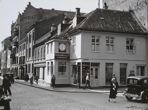 gateløp, forretningsgårder, hjørnegård, Fr. Aug. Michelet urmakerforretning, biler, mennesker, gateliv