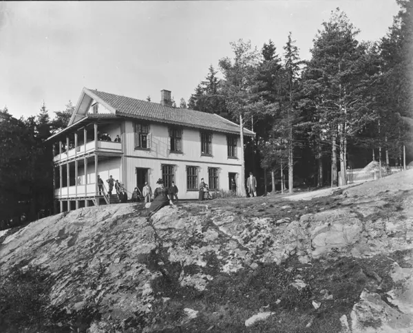 Nordgården (også kalt Jomfrulund), Jomfrubråtveien 32. Revet ca 1925. Damen på fjellet er Ahne Andersen som drev stedet. Faren eide restene av Jomfrubråten gård.