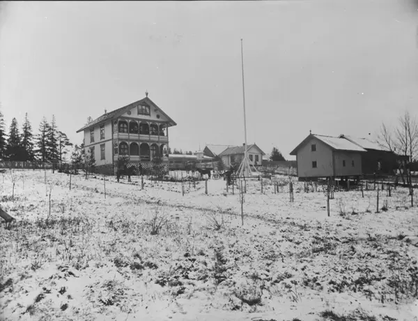 Dette er huset til eieren av Jomfrubråten gård. Huset lå mellom eiendommene han eide i Jomfrubråtveien 41 og 47. Huset ligger der i dag. Dette ble kalt Jomfrubråten gård og det har også vært uteserveing der på den tiden bildet er tatt.