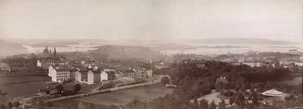 utsikt, park, musikkpaviljong, bygårder, trehus, Høien løkke, Slottet, Trefoldighetskirken, by, fjord