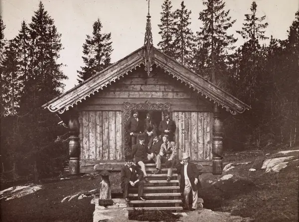 Frognerseteren, stabbur, trapp, gruppe, menn