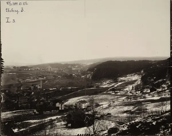 utsikt, kulturlandskap, trehusbebyggelse, fabrikkbygninger, Kværner Brug, jernbanelinje, skog