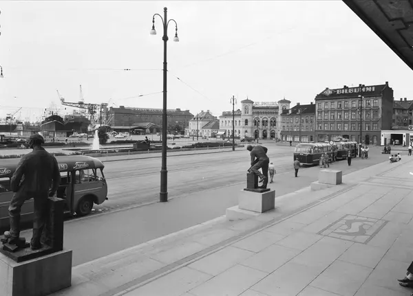 plass, mennesker, busser, gatebelysning, skulptur, havn, Vestbanestasjonen, Akers mek. Verksted, bygårder