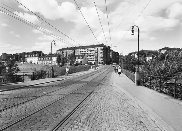 gateløp, gatelegeme, brostein, trikkeskinner, mennesker, bro, gatebelysning, rekkehus, bygårder, boligblokker