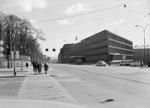 veikryss, gateløp, USAs ambassade, kontorbygning, bygårder, mennesker, biler, trafikklys, gatebelysning, park