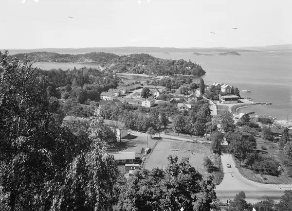 utsikt, Nedre Bekkelaget skole, veier, bebyggelse, sund, øyer, fjord