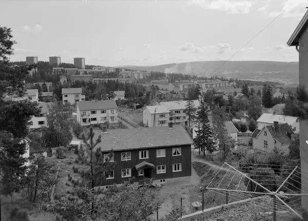 Bildet er tatt fra kollen bak Østreheimsveien mot Huldrefjellet. Huldresvingen krysser Østreheimsveien og går parallellt med denne det siste stykke bak Huldrefjellet. Bildet viser bebyggelse i Østreheimsveien foran, og i Huldresvingen bak. Bak der vises tårnblokkene og bebyggelsen på Rødberget (Tonsenhagen).