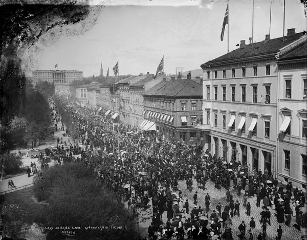 utsikt, gateløp, mennesker, 17. mai-feiring, 17. mai-tog, flagg, Grand Hotel, Søstrene Larsens Hotel, forrretningsgårder