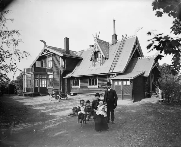 Villa Fridheim, gårdsplass, familiegruppe, hund