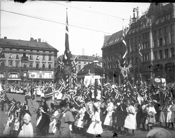 17. mai-feiring, barnetog, faner, flagg, forretningsgårder
