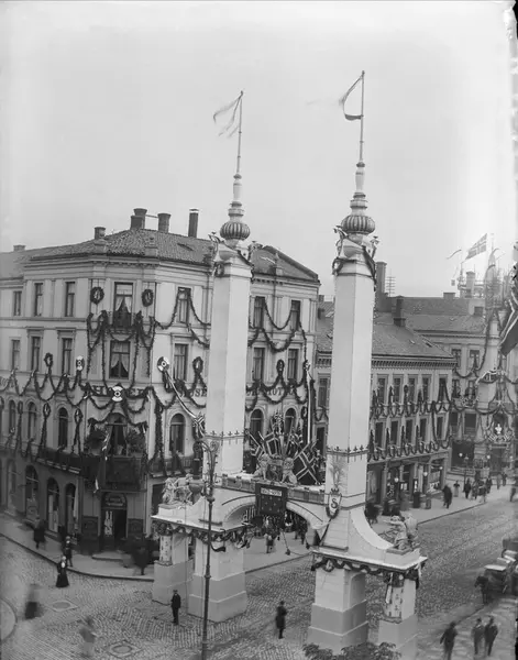 kongelig regjeringsjubileum, jubileumsfeiring, portal, flagg, girlander, forretningsgårder, gateliv