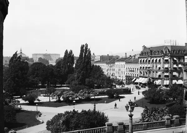 park, mennesker, biler, trikk, hotell Nobel, forretningsgårder, Slottet, Nationaltheatret