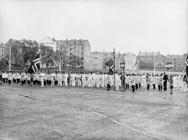 Bislett idrettsplass, turnstevne, turnere, opptog, faner, flagg, bygårder, gavlreklame, tobakksreklame