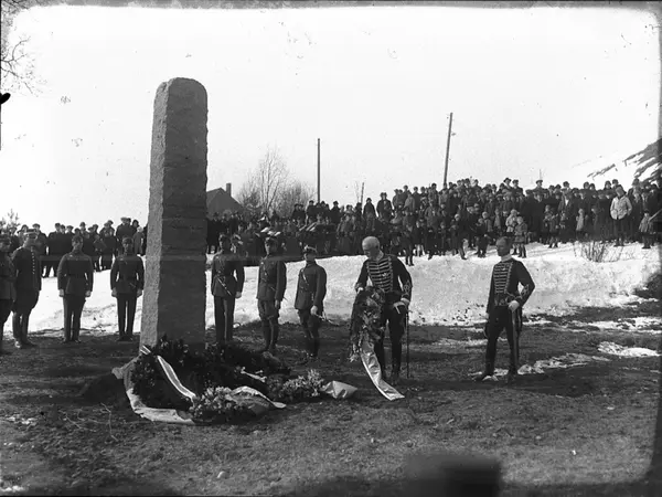 Bekransning av bauta reist på Kjeller utenfor Oslo til den svenske löytnant Gustav von Segebaden, som omkom ifm et flystevne på Hengsengen i 1921. Dato 6. mars 1926. kransnedleggelse ved Överste Axel Fredrik Ahnström, Livregementets husarer.