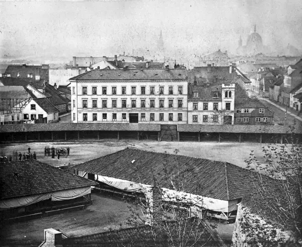 utsikt, ridebane, ekserserplass, mennesker, brakker, bygårder
