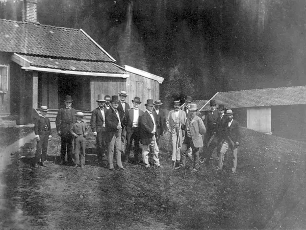 Thomas Heftye i midten. Hans svoger Jacob Andreas Faye var generalkonsul for Preussen, og er sannsynligvis en av de andre mennene på bildet. Husmannsstua er den eldste bygningen på Sarabråten.