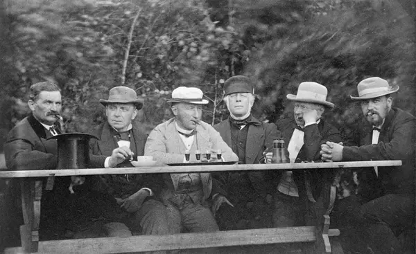 landsted, gruppe, menn, hatter, bord, snapseglass
