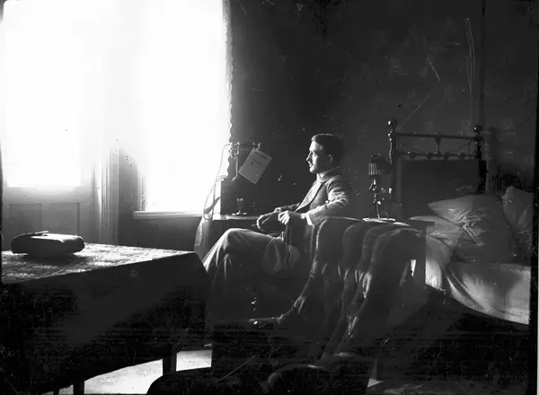 interiør, hotellrom, mann, sittende ved skrivebord, telefon, seng, vindu