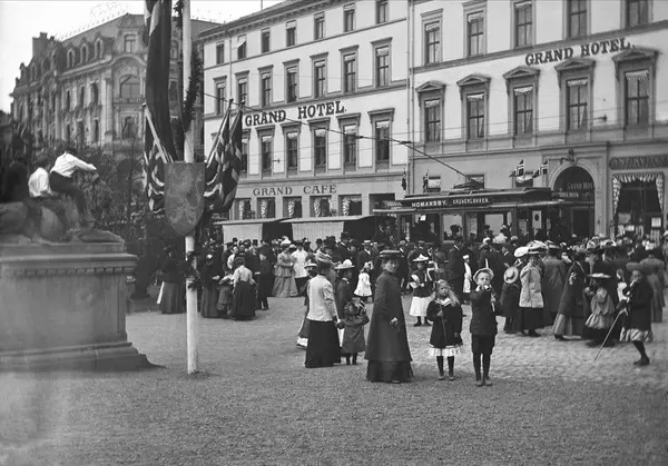 gateliv, Homansby-trikk, løveskulptur, barn, flagg, girlander, Grand Hotel