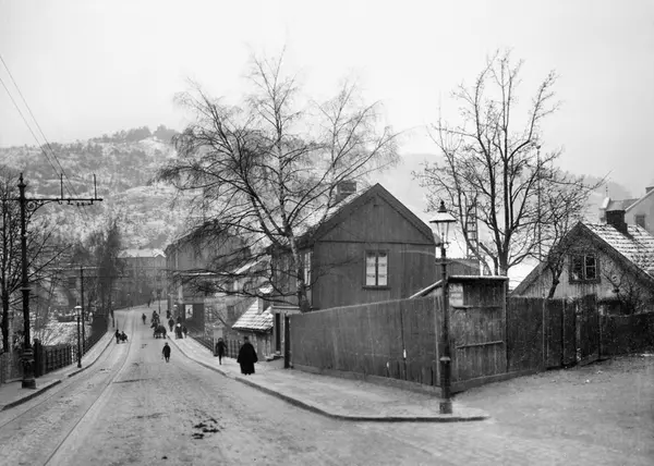 gateløp, trehusbebyggelse, plankegjerde, bro, mennesker, trikkelinje, gatebelysning, ås, skog, snø