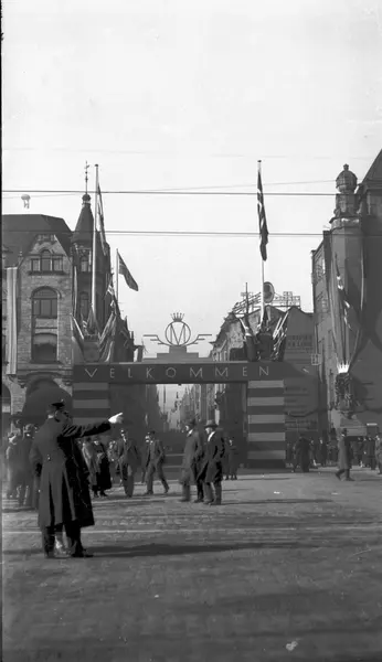 kronprinsbryllup, utsmykning, velkomstportal, monogram, flagg, riksvåpen, mennesker, bygårder