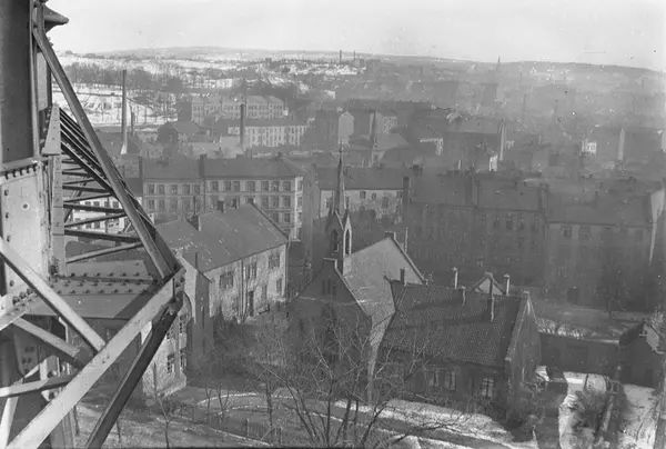 utsikt fra gassbeholder, Krohgstøtten sykehus, kapell, bygårder, Østre Frikirke, Vahl skole, park