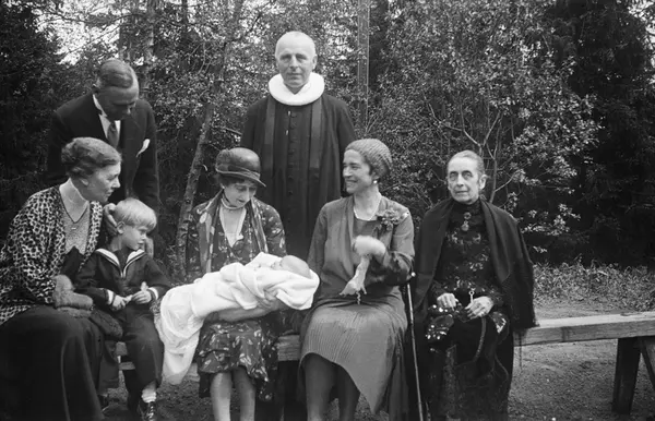 Bak fra venstre: Harald Astrup Salvesen (dåpsbarnets far) og sogneprest Ole S. Fodnes. Foran fra venstre: trolig Aagot Salvesen (dåpsbarnets farmor), Harald Salvesen (dåpsbarnets bror), dronning Maud med dåpsbarnet Salve Christian Salvesen, Sylvia Salvesen (dåpsbarnets mor), Ida Hellesen (dåpsbarnets mormor).