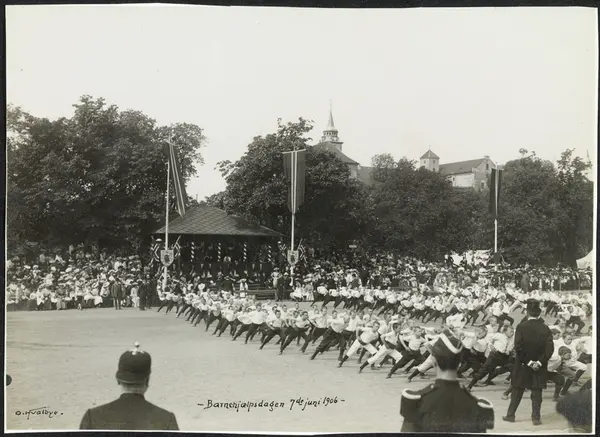 Festningsplassen, barnehjelpsdagen, gutter, turnere, kongetribunde, publikum, bannere, Akershus festning