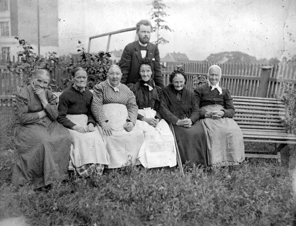 hage, benk, gruppe, gamle kvinner6, kvinneforening, mann, sogneprest