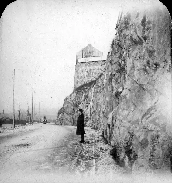 strand, seilskip, vei, bergvegg, Akershus festning, mann, snø