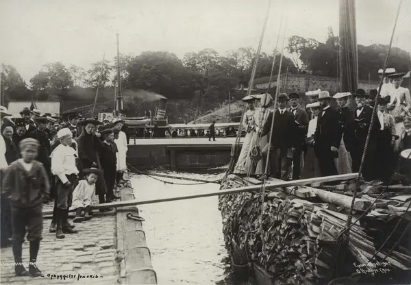 brygge, Christiania Indremisjons oppbyggelsesmøte fra fartøy, vedjakt, tilskuere, barn, dampskip