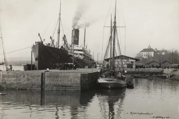 havn, dampskip, Amerikabåt, avgang, seilfartøy, havneskur, Akershus festning