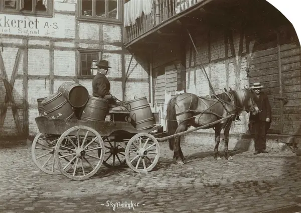 gårdsinteriør, bindingsverk, hest, vogn, skylledunker