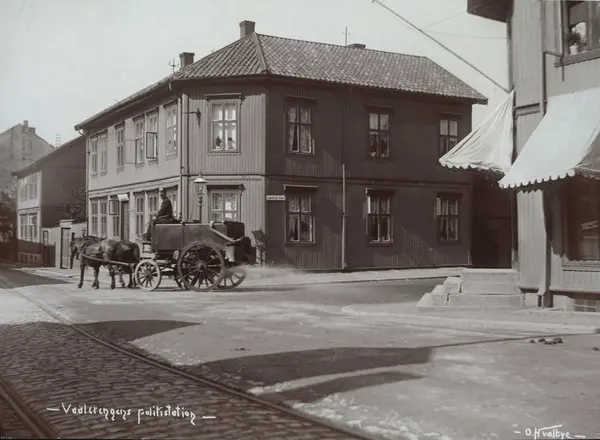 trehusbebyggelse, Vålerengen politistasjon, hest, vannvogn, vannspreder, hestepærer