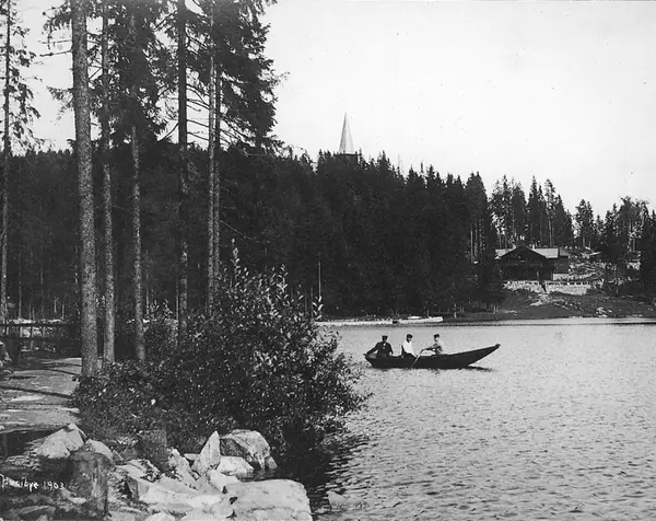 tjern, pram, menn3, roing, skog, Peisestuen, Holmenkollen kapell