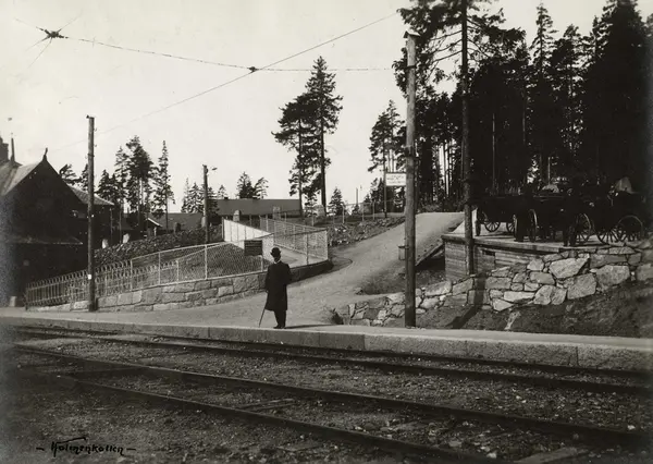 Bildet viser Besserud stasjon da den het Holmenkollen (1898-1915). Oscar Hvalbye (1864-1938) tok teologisk embetseksamen 25 år gammel. Han arbeidet for bymisjonen (Kristiania Indremisjon) og var prest i Sagene menighet. Som ivrig amatørfotograf samarbeidet han med sin gode venn Anders B. Wilse. Han var virksom i Oslo i perioden ca 1890-1920. Hans fotosamling ble i 1986 gitt til Oslo Bymuseum.