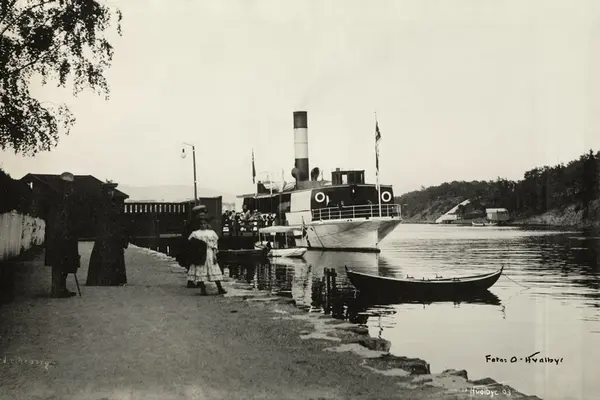 strandpromenade, mann, kvinne, jente, brygge, dampskip Louise II, robåt