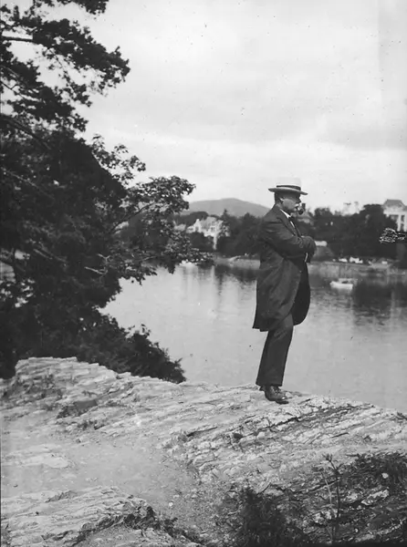 bergknaus, sedimentære bergarter, mann, panamahatt, pipe, sjakett, furuskog, fjord, villabebyggelse
